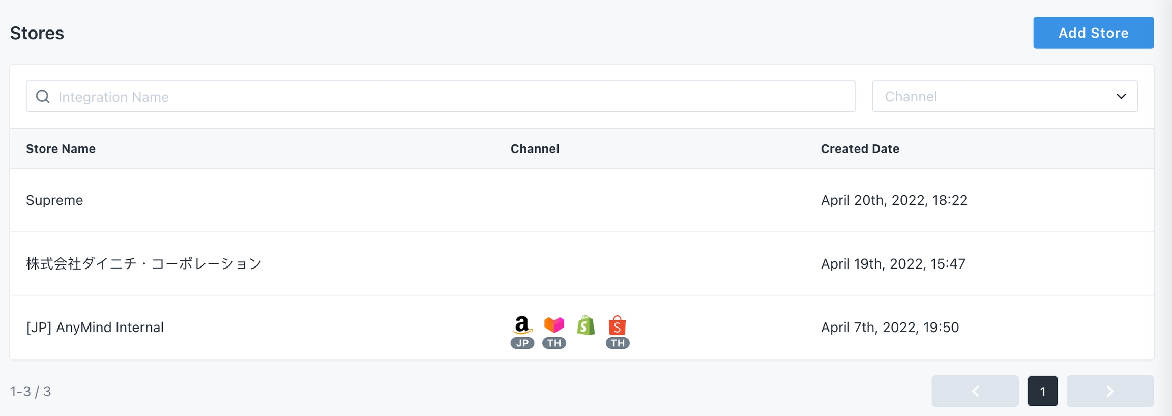From here, you can see a list of stores you've created and their channel connections. Within each store you can add / review the different store / marketplace connections to each.