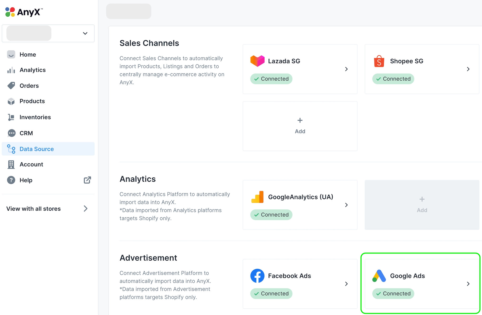 在“单一商店”视图中,点击数据源并选择您连接的广告平台