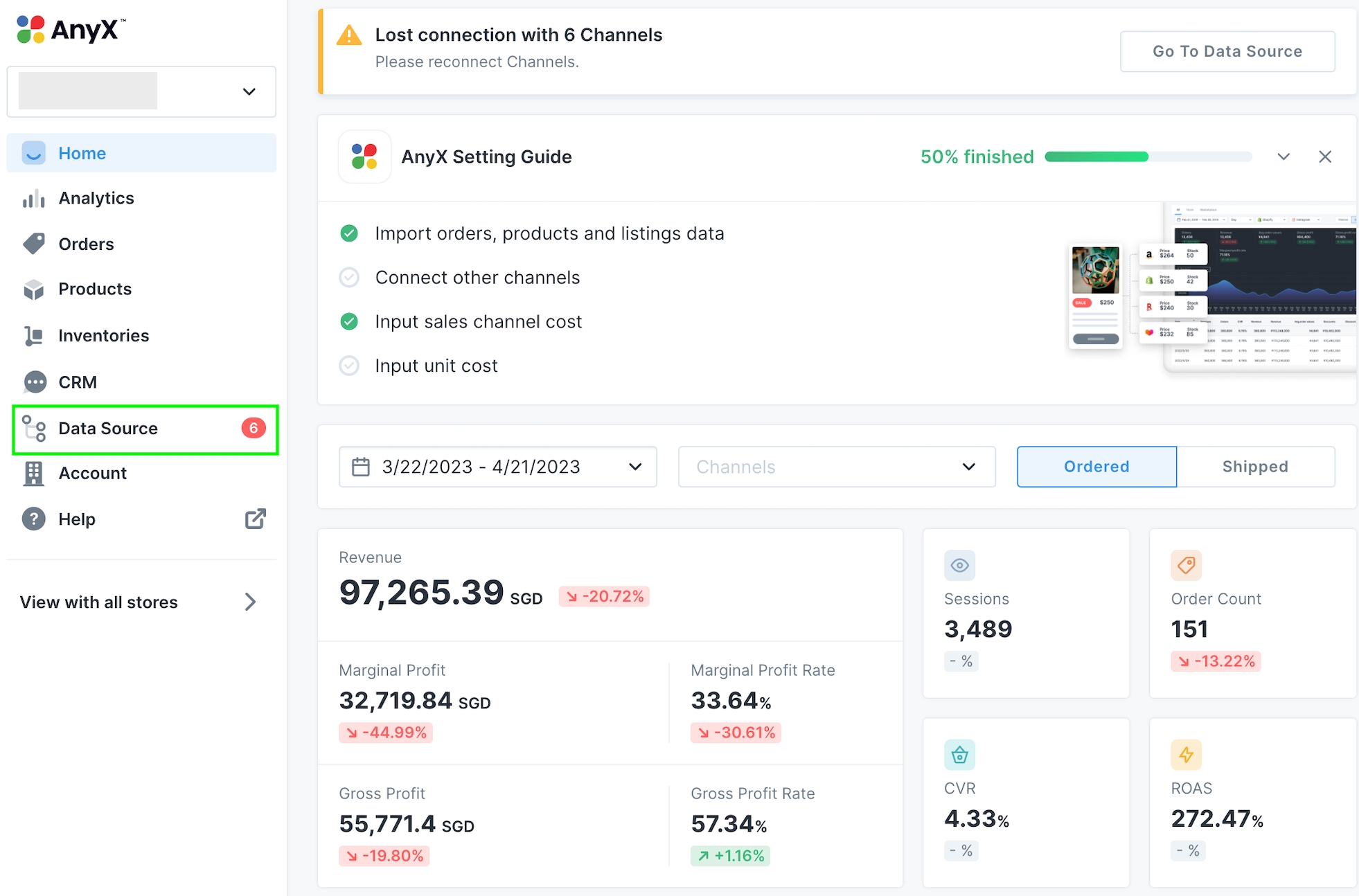 从连接的广告平台(谷歌广告,Facebook广告)收到的广告数据的总收入中,AnyX根据您选择的一组渠道和/或产品的总销售额,在给定的广告活动期间按比例分配它。