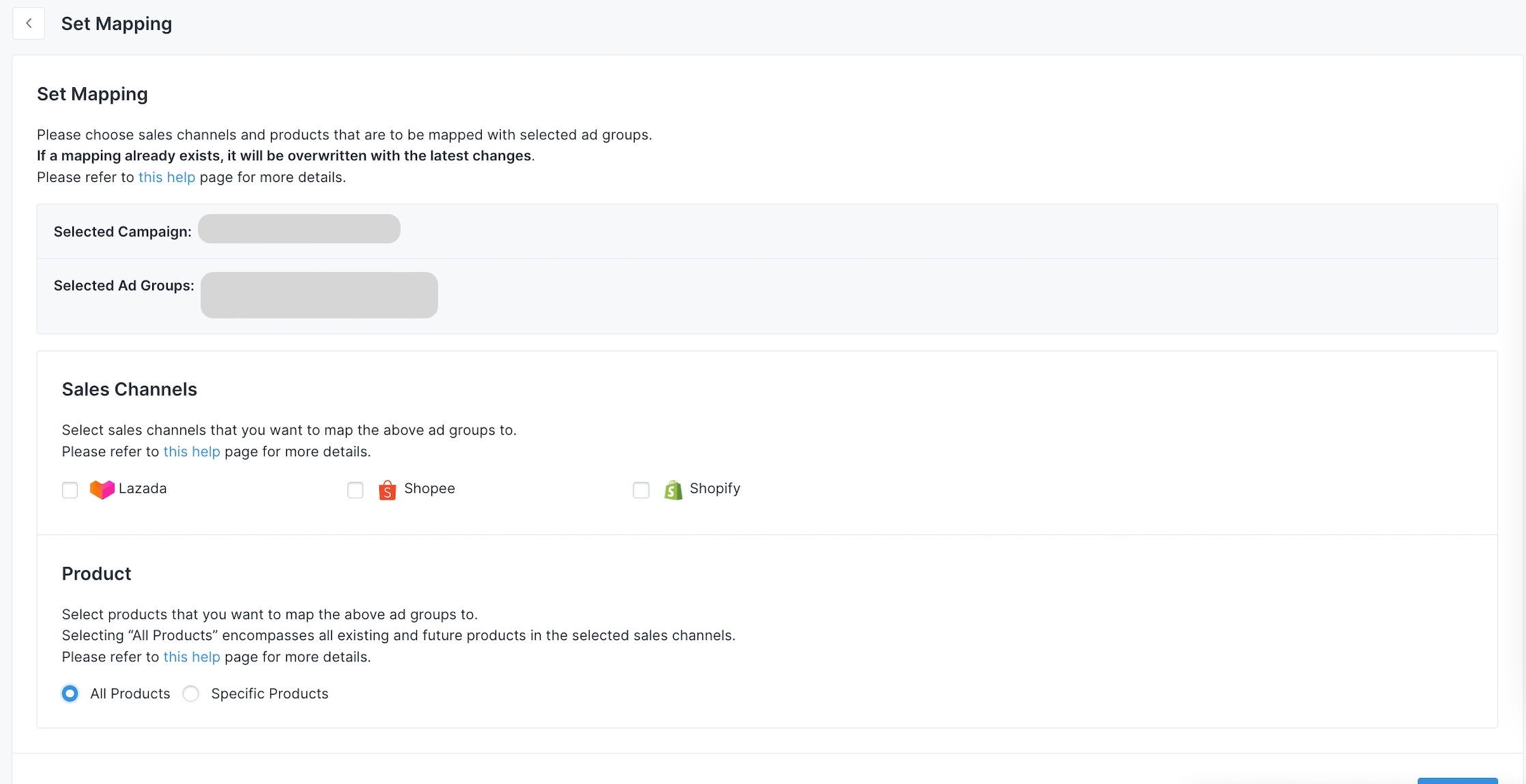 你可以从你连接的谷歌广告、Facebook广告和TikTok广告账户中定制广告组/广告集的映射,到你的商店和产品的特定渠道。