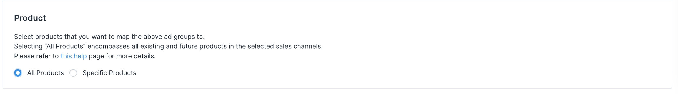 如果选择“所有产品”进行产品映射,则广告组/广告集成本和来自平台的归属收入将映射到所有现有产品以及添加到您渠道的未来产品。