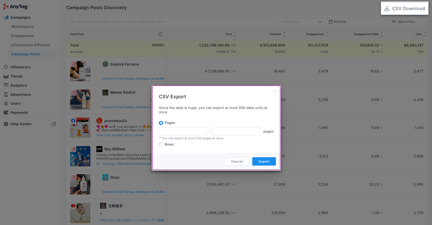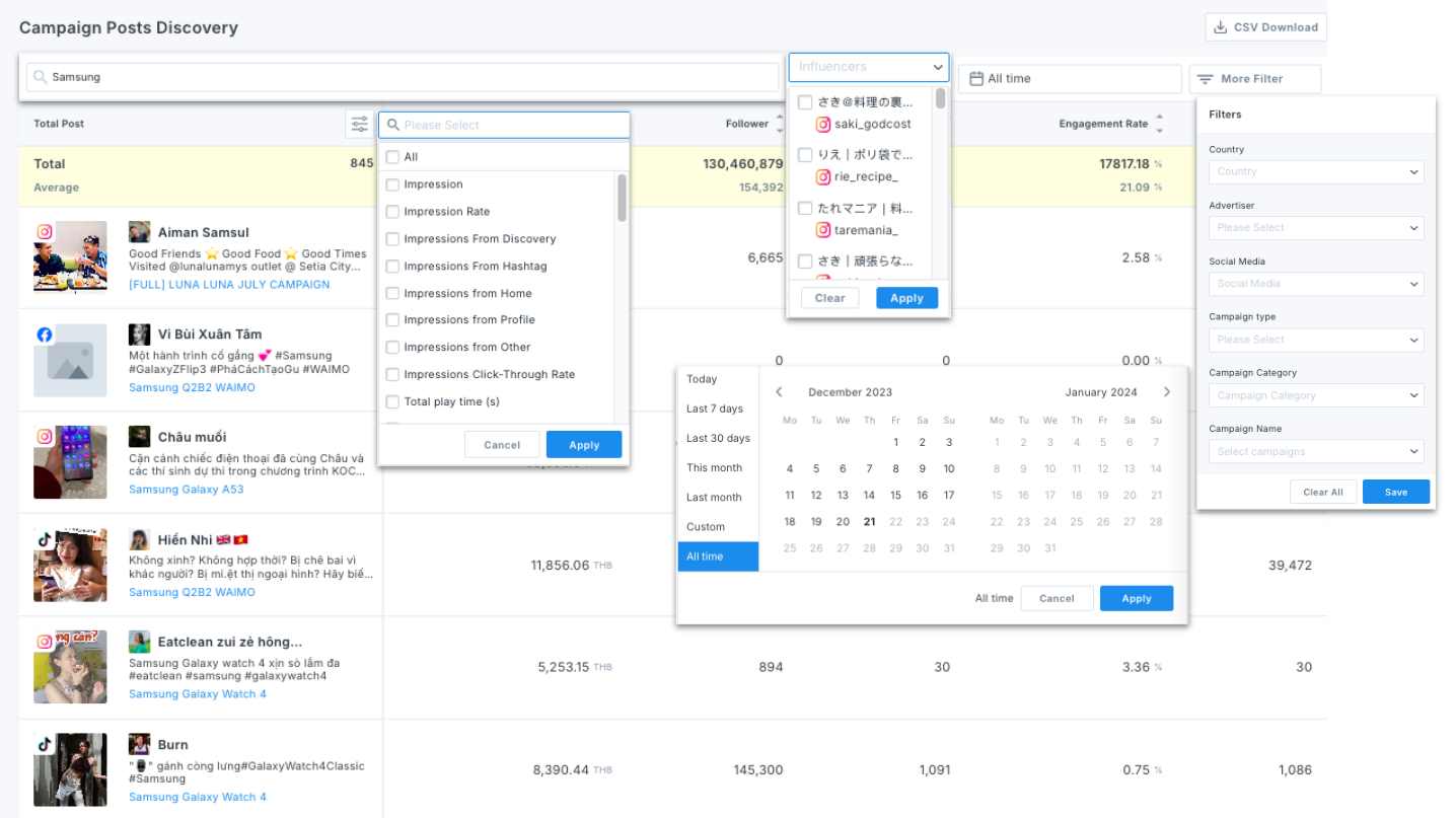 You can directly access the posts and influencer profiles through clicking on pictures/ influencers' names, and view campaign details through Campaign names.